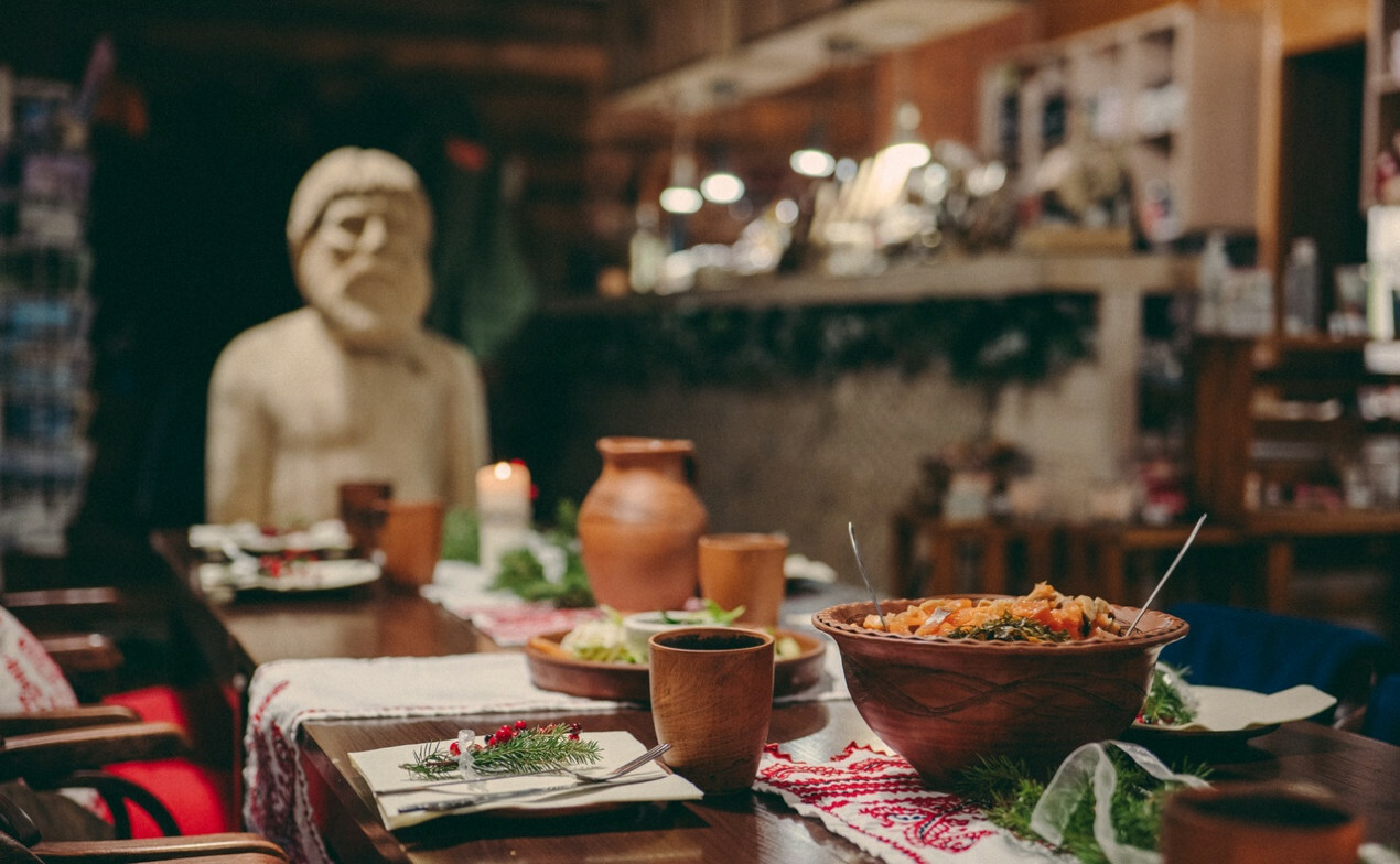Традиционное поморское застолье — это не просто еда, а целый ритуал, включающий блюда поморской кухни, напитки и особые правила. Застолье обычно проходило в большом углу избы, вокруг стола, где каждому отводилось своё место. Перед каждым гостем стояла миска и деревянная ложка.