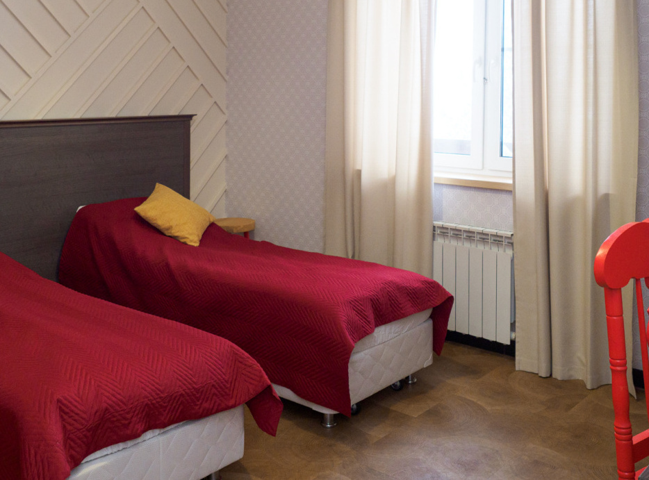 В номере есть двуспальная кровать, две односпальные или четыре односпальные кровати, шкаф, санузел с душевой, стол и стул. В стоимость включено постельное белье и полотенца. За дополнительную плату можно установить раскладушку.