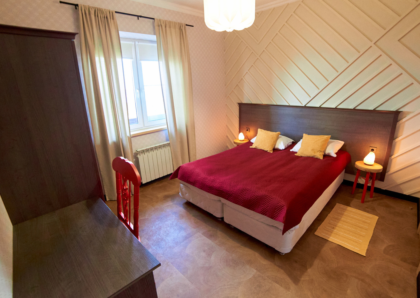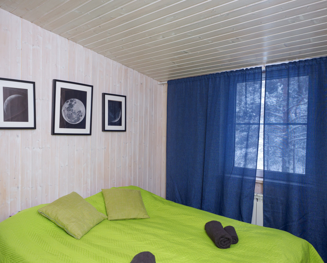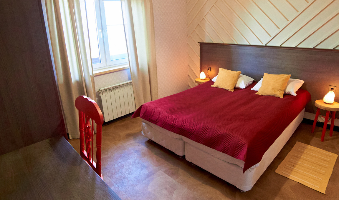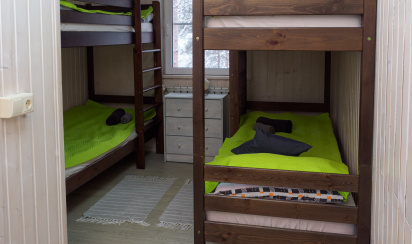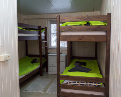 Коттедж также предлагает семейный двухкомнатный номер. Одна комната — спальня с двуспальной кроватью, другая — детская с двумя двухъярусными кроватями. Между номерами небольшой холл с диваном. В такой комбинации можно разместить до восьми человек.