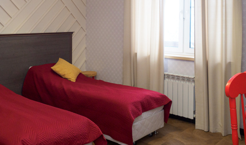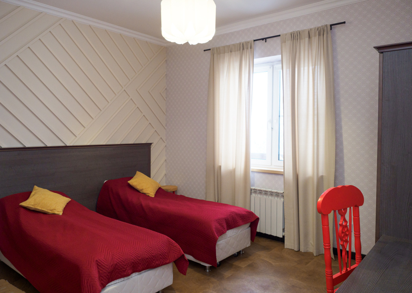 В номере есть двуспальная кровать, две односпальные или четыре односпальные кровати, шкаф, санузел с душевой, стол и стул. В стоимость включено постельное белье и полотенца. За дополнительную плату можно установить раскладушку.