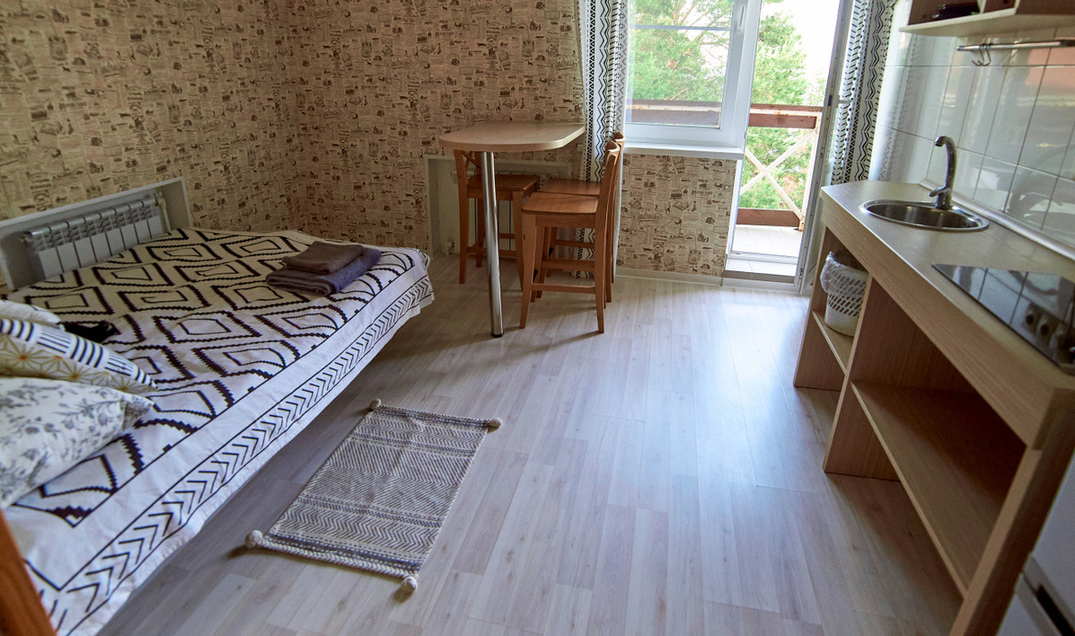 В коттедже «Земля» номера категории «Стандарт» находятся на первом этаже. Они состоят из двух комнат и санузла. В каждой комнате есть двуспальная и три односпальные кровати. Эти просторные номера идеально подходят для семейного отдыха. Также можно выбрать уютные экодомики на скале с панорамным окном. В экодомиках есть кровать, стол, стулья, теплый пол и обогреватель. Обратите внимание, что в экодомиках нет кухни и холодильника, а санитарные комнаты расположены в отдельном здании. Домики находятся в начале этнопарка, примерно в 600 метрах от кафе.