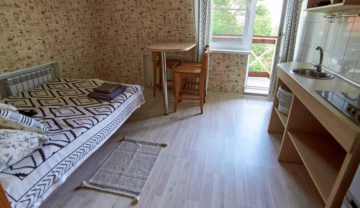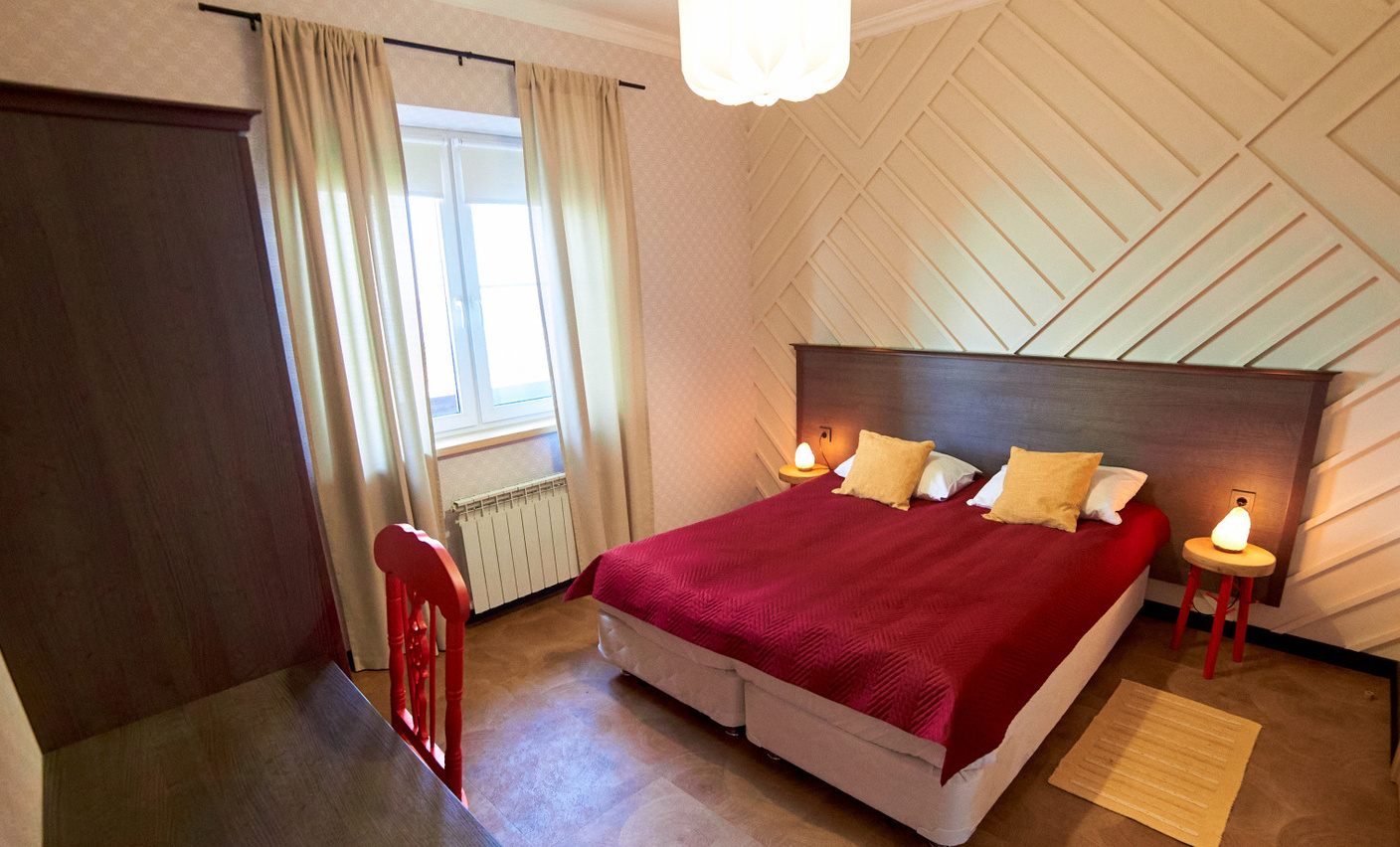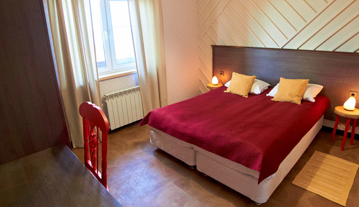 В коттедже «Земля» номера категории «Стандарт» находятся на первом этаже. Они состоят из двух комнат и санузла. В каждой комнате есть двуспальная и три односпальные кровати. Эти просторные номера идеально подходят для семейного отдыха. Также можно выбрать уютные экодомики на скале с панорамным окном. В экодомиках есть кровать, стол, стулья, теплый пол и обогреватель. Обратите внимание, что в экодомиках нет кухни и холодильника, а санитарные комнаты расположены в отдельном здании. Домики находятся в начале этнопарка, примерно в 600 метрах от кафе.
