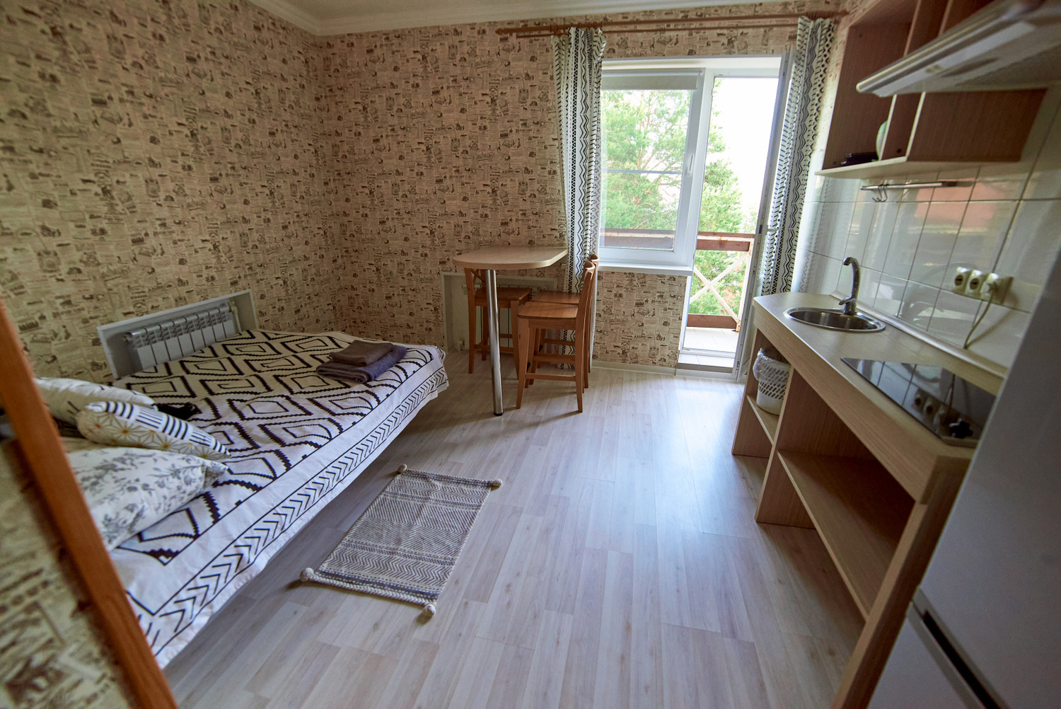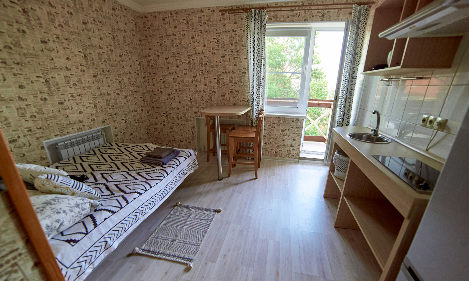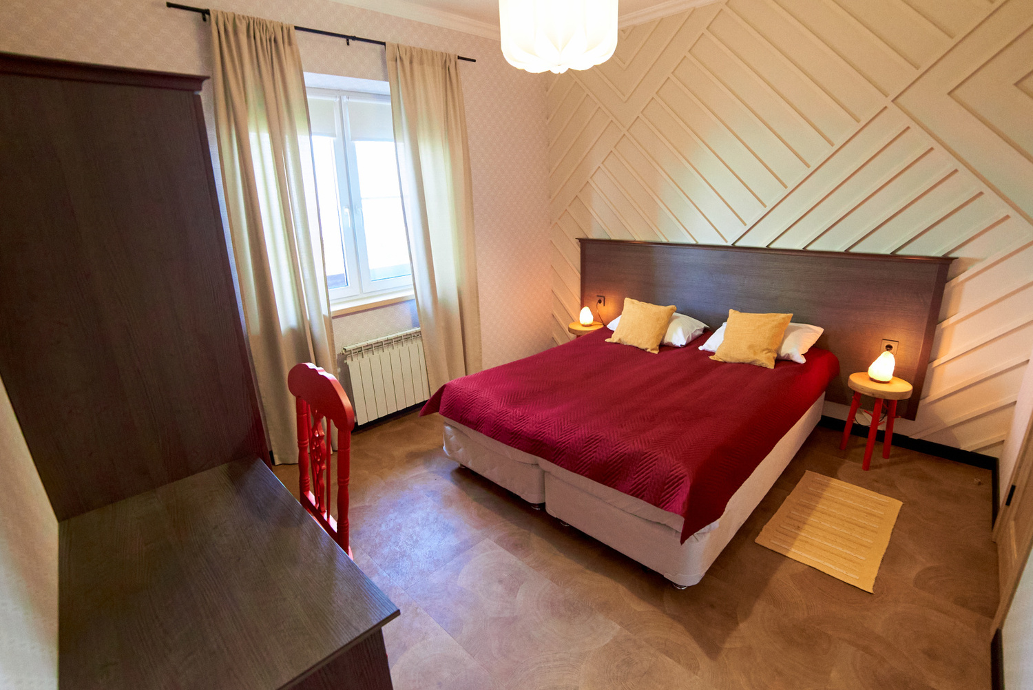 В коттедже «Земля» номера категории «Стандарт» находятся на первом этаже. Они состоят из двух комнат и санузла. В каждой комнате есть двуспальная и три односпальные кровати. Эти просторные номера идеально подходят для семейного отдыха. Также можно выбрать уютные экодомики на скале с панорамным окном. В экодомиках есть кровать, стол, стулья, теплый пол и обогреватель. Обратите внимание, что в экодомиках нет кухни и холодильника, а санитарные комнаты расположены в отдельном здании. Домики находятся в начале этнопарка, примерно в 600 метрах от кафе.
